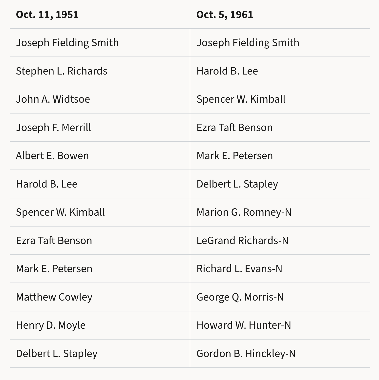 En octubre de 1951, el presidente David O. McKay dirigía la Iglesia junto a sus consejeros Stephen L. Richards y J. Reuben Clark. Diez años después, en octubre de 1961, McKay aún presidía, pero ahora trabajaba con tres consejeros: Henry D. Moyle, J. Reuben Clark y Hugh B. Brown.