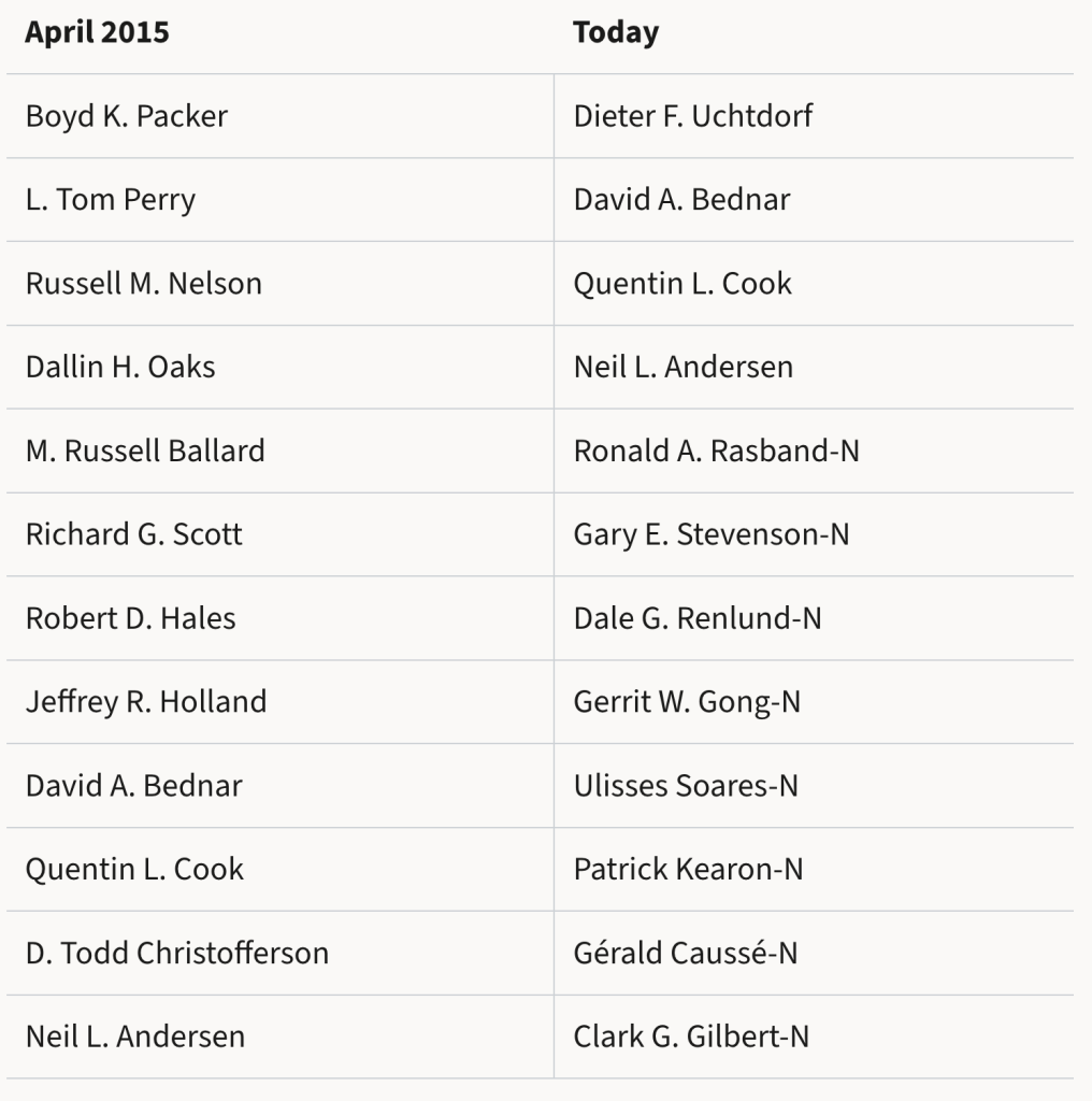 En abril de 2015, el presidente Thomas S. Monson presidía la Iglesia junto a Henry B. Eyring y Dieter F. Uchtdorf como consejeros. Desde entonces, el liderazgo ha cambiado de manera significativa.