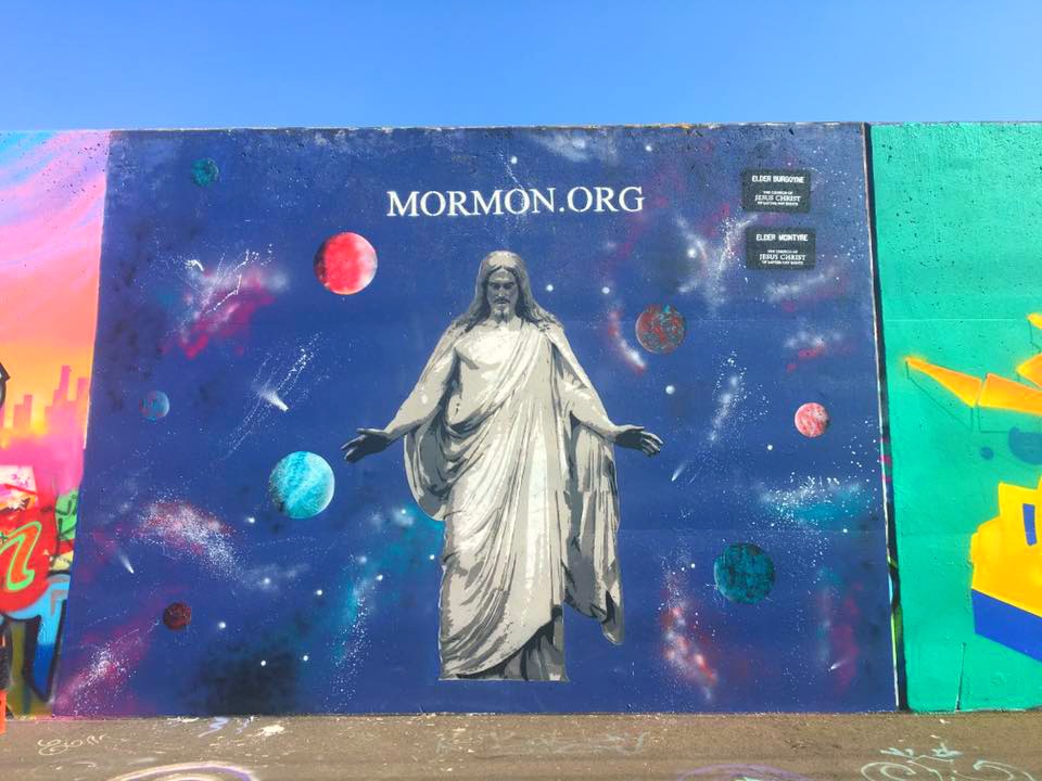 El mural representa el Christus en el centro del universo, completo con los planetas, la nebulosa, y las estrellas. A lo largo de dos días, los élderes Burgoyne y Mcintyre utilizaron cinco diferentes plantillas para pintar el Christus y utilizaron una amplia variedad de colores.»Elegí al Jesús resucitado porque eso es lo que nuestra iglesia representa», dijo Burgoyne. «Que vive hoy.