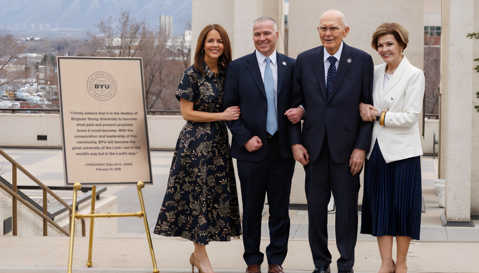 El presidente Dallin H. Oaks y su esposa, Kristen junto a una nueva placa con una cita del presidente Oaks. Los acompañan el presidente de BYU, C. Shane Reese, y su esposa, Wendy. Imagen: La Iglesia de Jesucristo de los Santos de los Últimos Días