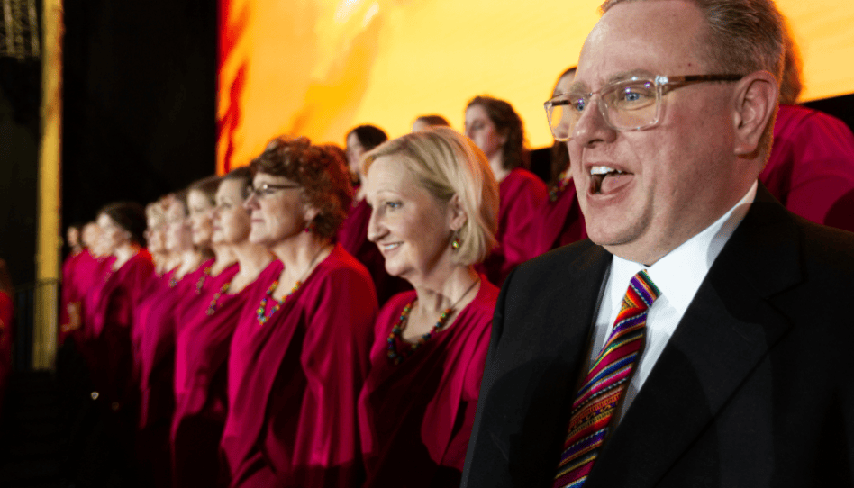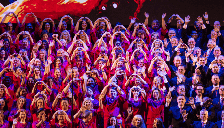 Miembros del Coro del Tabernáculo de la Manzana del Templo expresan su amor y gratitud a la audiencia cerca del final del concierto «Canciones de Esperanza» en el Estadio Nacional de Lima, Perú, el sábado 22 de febrero de 2025. Imagen: La Iglesia de Jesucristo de los Santos de los Últimos Días