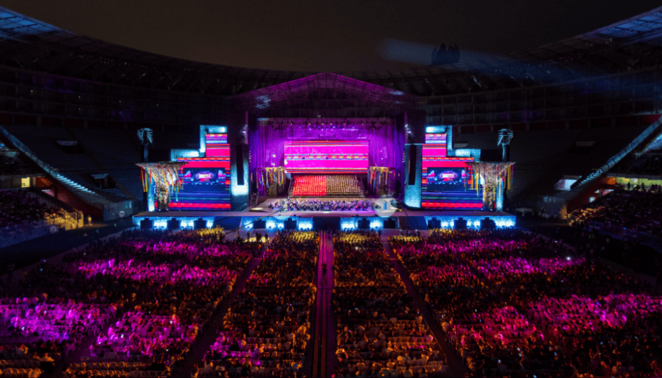 El Coro del Tabernáculo y la Orquesta de la Manzana del Templo interpretan su primera pieza ante una multitud récord de más de 35,000 personas durante su concierto «Canciones de Esperanza» en el Estadio Nacional de Lima, Perú, el sábado 22 de febrero de 2025. Imagen: La Iglesia de Jesucristo de los Santos de los Últimos Días