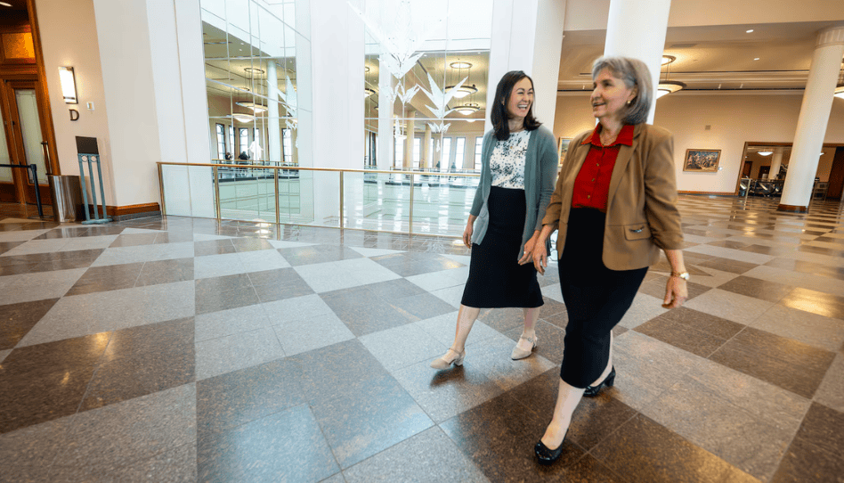 La hermana Kristin M. Yee (izquierda) y la hermana J. Anette Dennis, de la presidencia general de la Sociedad de Socorro, en el Centro de Conferencias de Salt Lake City, el viernes 5 de diciembre de 2025, durante la grabación del devocional de la Sociedad de Socorro de marzo de 2026. Créditos: Scott G. Winterton, Deseret News