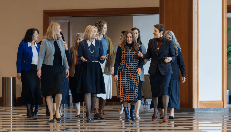 La Presidenta General de la Sociedad de Socorro, Camille N. Johnson (centro), junto a las integrantes del consejo asesor general de la Sociedad de Socorro en marzo de 2026 en el Centro de Conferencias de Salt Lake City el viernes 5 de diciembre de 2025. Créditos: Scott G. Winterton, Deseret News