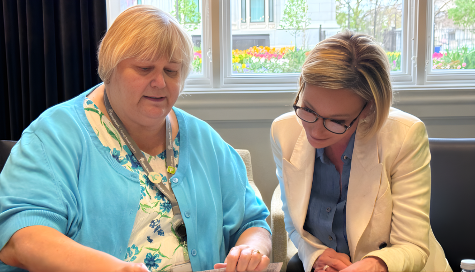 La asesora principal de la Casa Blanca en materia de fe, Paula White-Cain (derecha), recibe su historia familiar de manos de Vicki Standing, especialista en investigación de FamilySearch, en Temple Square, Salt Lake City, Utah, el viernes 10 de abril de 2026. Imagen: La Iglesia de Jesucristo de los Santos de los Últimos Días.