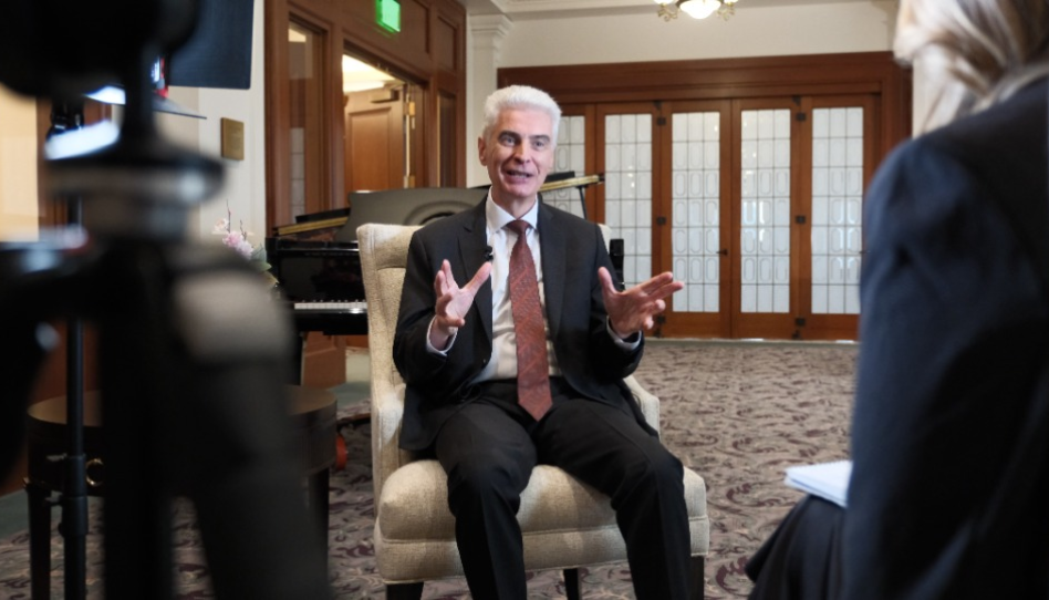 Élder Gérald Caussé habla con miembros de los medios de comunicación en el Edificio Conmemorativo de José Smith. Imagen: La Iglesia de Jesucristo de los Santos de los Últimos Días