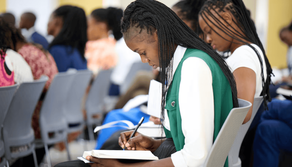 Una misionera del Centro de Capacitación Misional de la República Democrática del Congo toma notas durante una devocional con el élder Ronald A. Rasband, del Cuórum de los Doce Apóstoles, el domingo 2 de noviembre de 2025. Imagen: La Iglesia de Jesucristo de los Santos de los Últimos Días.