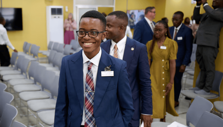 Un misionero sonríe durante una visita al élder Ronald A. Rasband, del Cuórum de los Doce Apóstoles, en el Centro de Capacitación Misional de la República Democrática del Congo, el domingo 2 de noviembre de 2025. Imagen: La Iglesia de Jesucristo de los Santos de los Últimos Días.
