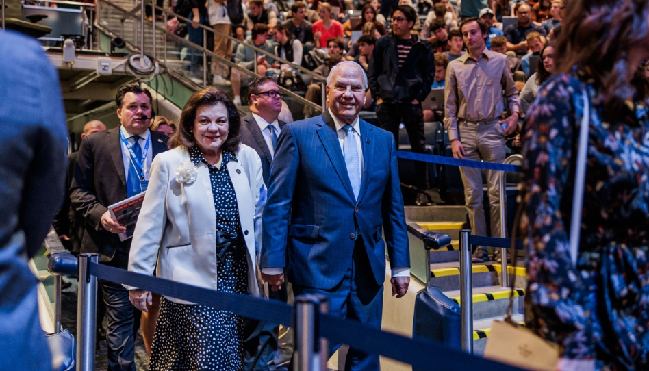 El élder Ronald A. Rasband, del Cuórum de los Doce Apóstoles, y su esposa, Melanie, llegan al Marriott Center en Provo, Utah, el martes 23 de septiembre de 2025. Imagen: La Iglesia de Jesucristo de los Santos de los Últimos Días