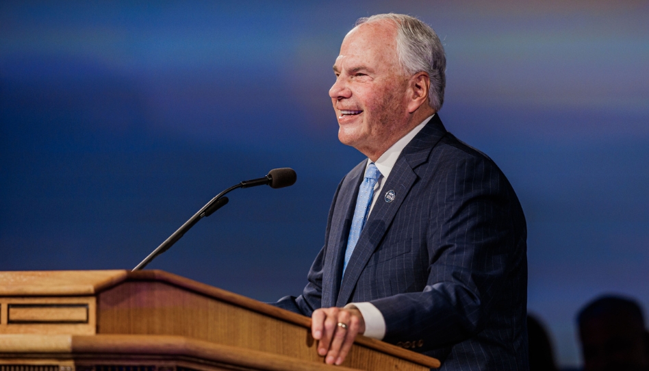 El élder Ronald A. Rasband, del Cuórum de los Doce Apóstoles, habla con los estudiantes y profesores de BYU en el Centro Marriott en Provo, Utah, el martes 23 de septiembre de 2025. Imagen: La Iglesia de Jesucristo de los Santos de los Últimos Días