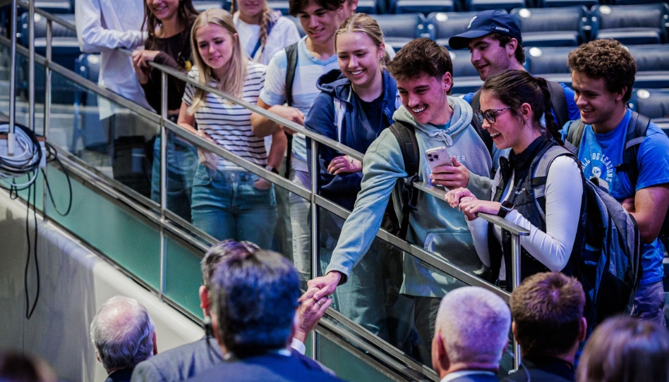 El élder Ronald A. Rasband, del Cuórum de los Doce Apóstoles, saluda a los estudiantes de BYU en el Marriott Center en Provo, Utah, el martes 23 de septiembre de 2025. Imagen: La Iglesia de Jesucristo de los Santos de los Últimos Días
