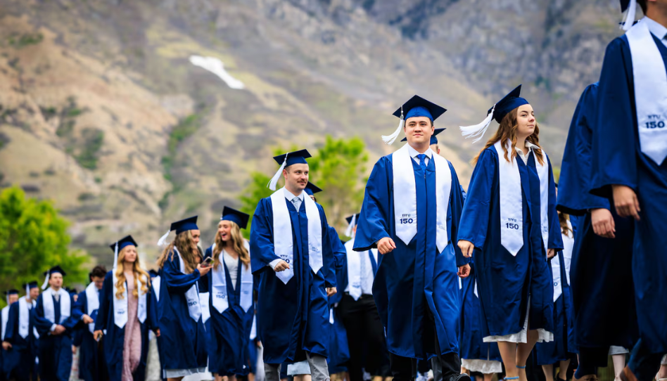 Los estudiantes de BYU caminan hacia su ceremonia de graduación en Provo, Utah, el jueves 23 de abril de 2026. Créditos: Laura Seitz. Imagen: Noticias Deseret