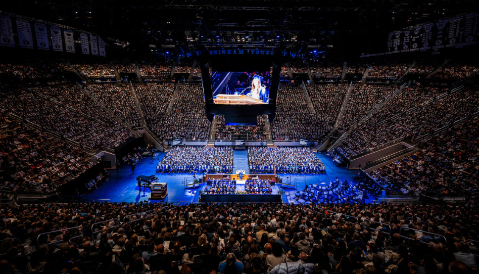 Más de 7000 graduados de BYU, junto con sus familiares y amigos, llenan el Marriott Center para la ceremonia de graduación en Provo, Utah, el jueves 23 de abril de 2026. Créditos: Nate Edwards. Imagen: BYU