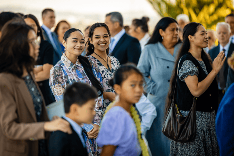 La ceremonia incluyó testimonios de líderes y miembros, entre ellos el presidente Selesi’utele Lavea, la hermana Camellia Lavea y la joven Leilani Tawhiti, quienes compartieron su amor por Jesucristo y Su santa casa. Un coro de seis hombres y seis mujeres acompañó el evento con himnos dedicados al Salvador.