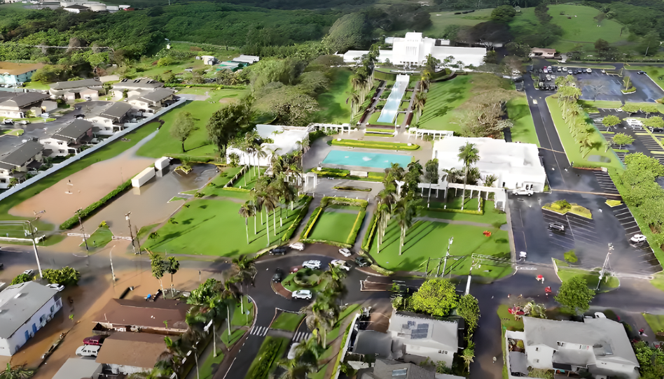 Laie, una pequeña pero significativa comunidad para los Santos de los Últimos Días, fue una de las zonas más afectadas. Imágenes aéreas muestran calles completamente cubiertas de agua y viviendas seriamente dañadas.