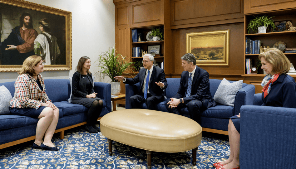 El élder Gerrit W. Gong (centro), del Cuórum de los Doce Apóstoles, y el élder Matthew S. Holland (derecha) conversan con la presidenta de America250, Rosie Rios (izquierda), en el Edificio Conmemorativo José Smith, el jueves 13 de noviembre de 2025. Imagen. La Iglesia de Jesucristo de los Santos de los Últimos Días