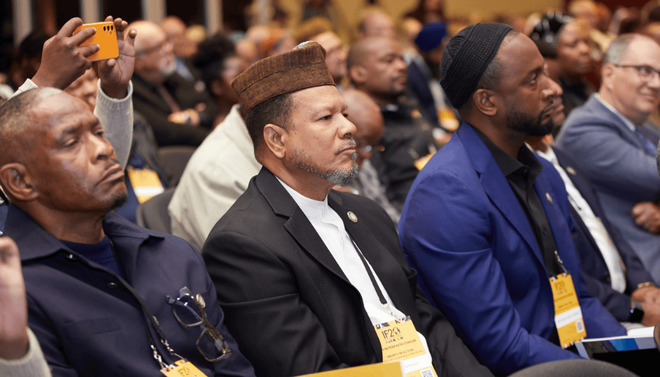 A la izquierda, el élder Thierry K. Mutombo, presidente del Área África Central de la Iglesia, participa en el Foro Interreligioso del G20 (IF20) en Ciudad del Cabo, Sudáfrica, el lunes 11 de agosto de 2025. Imagen: La Iglesia de Jesucristo de los Santos de los Últimos Días