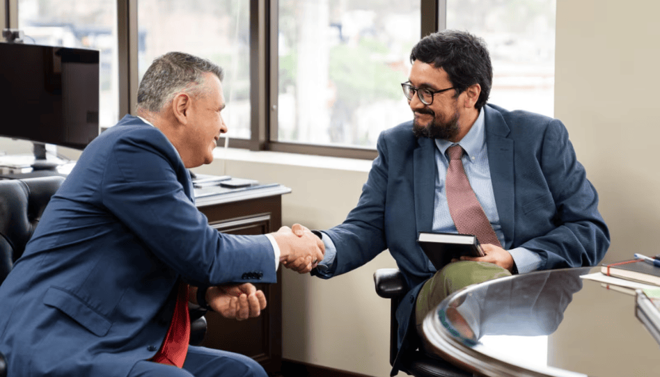 El élder Joaquín E. Costa, Setenta Autoridad General y presidente del Área Sudamérica Sur de la Iglesia, estrecha la mano de un funcionario del gobierno chileno en Santiago, Chile, a principios de febrero de 2026. Imagen: La Iglesia de Jesucristo de los Santos de los Últimos Días