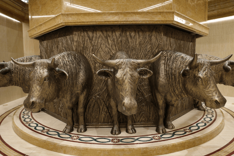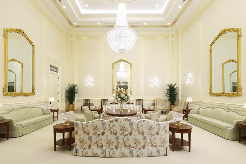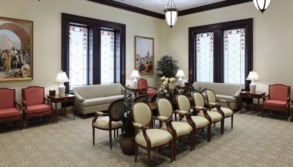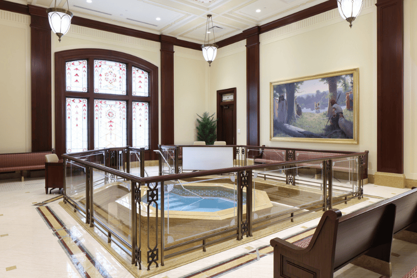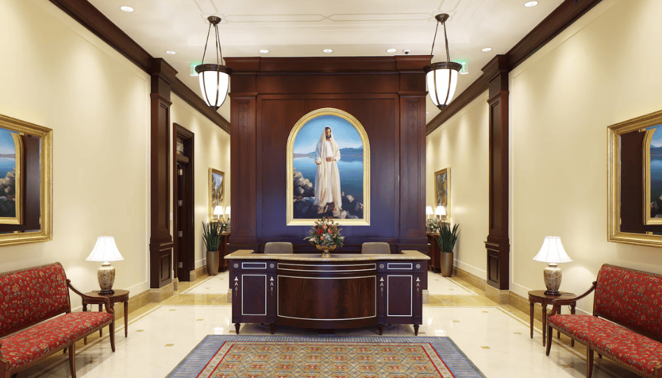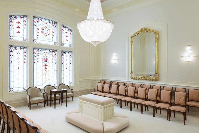 Los candelabros y lámparas de cristal iluminan espacios como la sala celestial, las salas de sellamiento y el cuarto de novias.