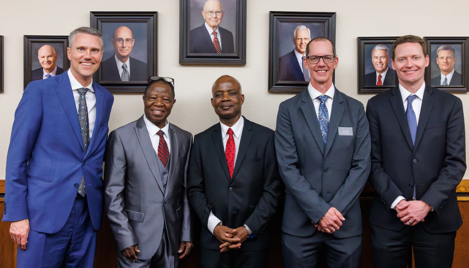 De izquierda a derecha: Benjamin Boettcher, presidente de la Estaca Boise, Idaho; Blema Fangamou, primer consejero del obispado del Barrio Treasure Valley (swahili); el obispo Denis Akulu; Adam Pishl, segundo consejero; y W. Blake Bybee, expresidente de rama del barrio cuando era una rama. Imagen: Fabiana Huffaker