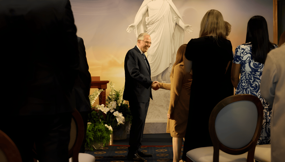 El élder Neil L. Andersen, del Cuórum de los Doce Apóstoles, saluda a los jóvenes adultos en los terrenos del Templo de Washington D.C. el 18 de octubre de 2025. Imagen: La Iglesia de Jesucristo de los Santos de los Últimos Días