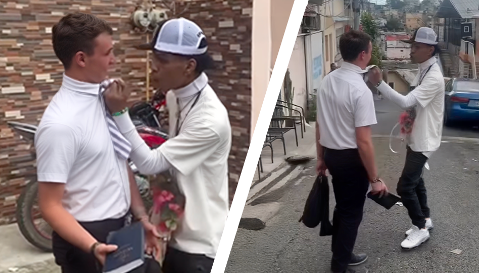 Es inaudito se normalice el irracional actuar de este seudo artista. Sin respeto a estos jóvenes misioneros, quizá la persona que esta filmando lo tome como algo que servirá a este «artista» en su entorno, pero sabemos que a los ojos de Dios y de personas normales, es una gran ofensa…que Dios lo perdone y tenga misericordia de este joven.