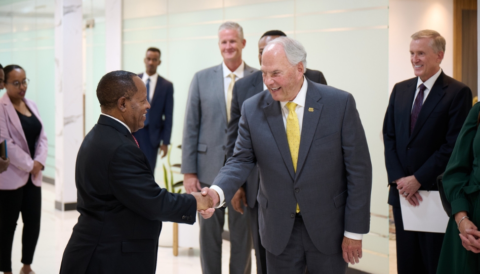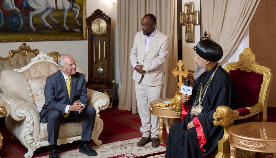 Durante su visita a Addis Abeba, el élder Rasband compartió un momento significativo con Su Santidad Abune Mathias I, patriarca de la Iglesia Ortodoxa Etíope, a quien obsequió una pequeña estatua del Cristo como muestra de respeto entre ambas tradiciones cristianas.