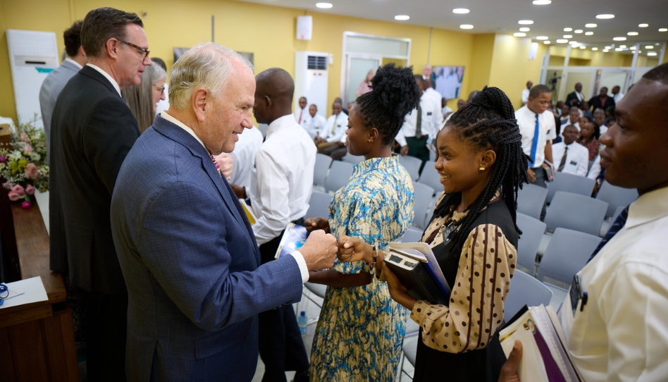 En Brazzaville, el élder Rasband caminó por los pasillos del Centro Educativo BYU–Pathway Worldwide. Las aulas estaban tan llenas que algunos estudiantes seguían la clase desde la puerta. Muchos sostenían cuadernos desgastados, otros practicaban inglés con frases sencillas, pero todos compartían el mismo espíritu de superación.