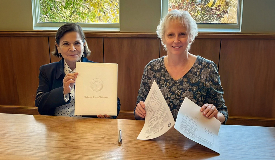 En una visita oficial a Provo, Utah, la rectora Dra. Jeri Gloria Ramón Ruffner de Vega firmó un acuerdo marco de cooperación con la vicerrectora académica de BYU, Dra. Renata Forste, en una reunión llevaba a cabo el 5 de noviembre en el Centro Gordon B. Hinckley de la universidad.