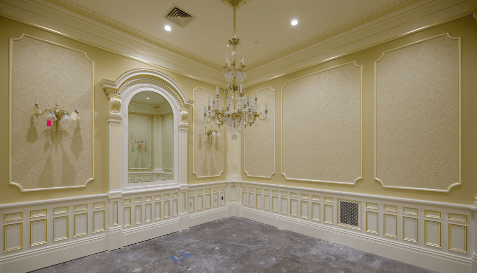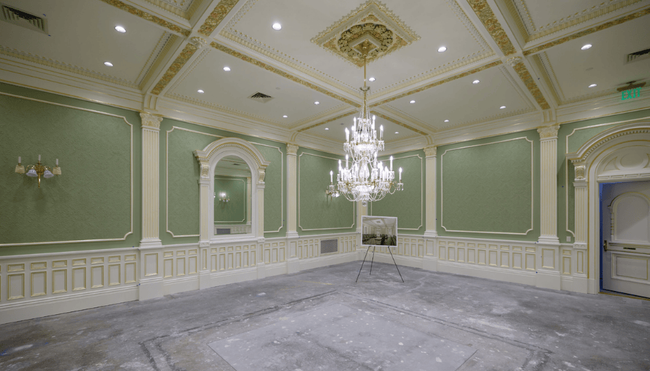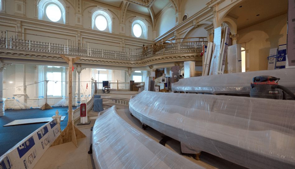 El gran salón de asambleas, ubicado en el quinto piso del templo y destinado a reuniones especiales y consejos de líderes, ya está libre de andamios. Actualmente se realizan trabajos de acabado en este histórico espacio.