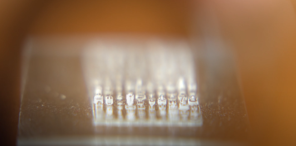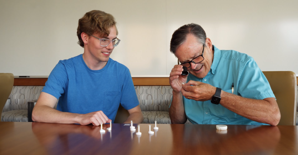 El profesor de ingeniería eléctrica Greg Nordin y el estudiante Callum Galloway fabricaron 150 réplicas microscópicas de templos existentes, todas diferentes, para conmemorar los 150 años de BYU. Cada uno mide menos que un grano de arroz y está impreso con tecnología 3D de altísima resolución.