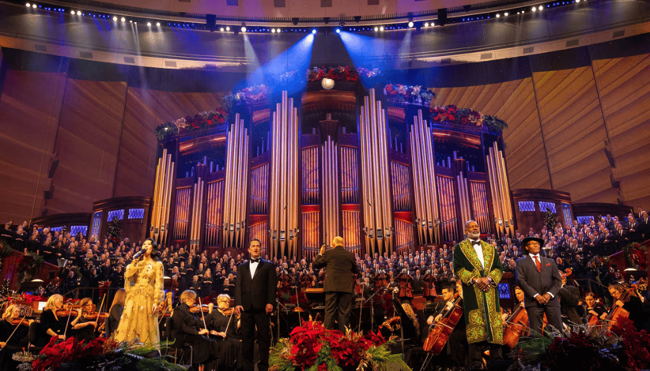 La cantante invitada Ruthie Ann Miles (izquierda), el director asociado del coro Ryan Murphy, el actor Dennis Haysbert (centro derecha) y Charles Mulli, de Kenia, clausuran el concierto de Navidad del Coro del Tabernáculo 2024 en el Centro de Conferencias de Salt Lake City, el jueves 19 de diciembre de 2024. La estrella de Broadway Stephanie J. Block y su esposo, la estrella de «Madam Secretary», Sebastian Arcelus, son los artistas invitados para los conciertos de 2025. Imagen: La Iglesia de Jesucristo de los Santos de los Últimos Días.
