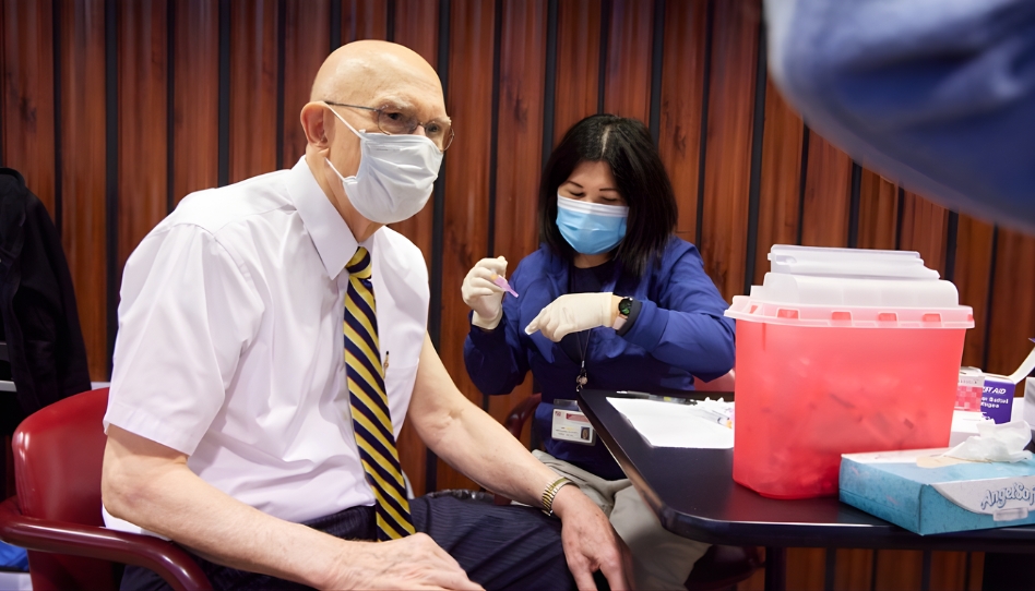 El presidente Dallin H. Oaks recibe la vacuna contra la COVID-19. Con este gesto, dio ejemplo de responsabilidad y confianza en los esfuerzos por cuidar la salud y el bienestar de la comunidad.