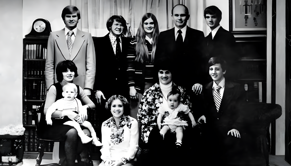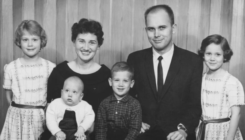 En esta foto, Dallin H. Oaks aparece junto a su esposa June y sus hijos pequeños. A pesar de las exigencias de su carrera, siempre priorizó el hogar y enseñó que la verdadera felicidad empieza en la familia.