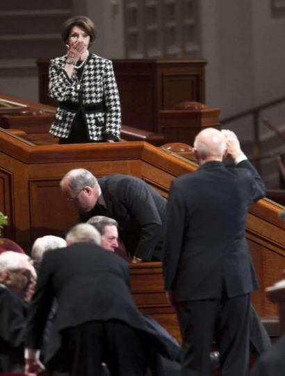 En esta imagen, el élder Dallin H. Oaks saluda a su esposa, la hermana Kristen Oaks, durante una sesión de conferencia. Ese pequeño gesto refleja el profundo cariño y la complicidad que comparten, incluso en medio de sus deberes como líderes de la Iglesia.