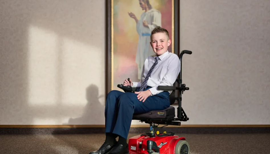 Easton Jolley en su silla de ruedas. Imagen: La Iglesia de Jesucristo de los Santos de los Últimos Días