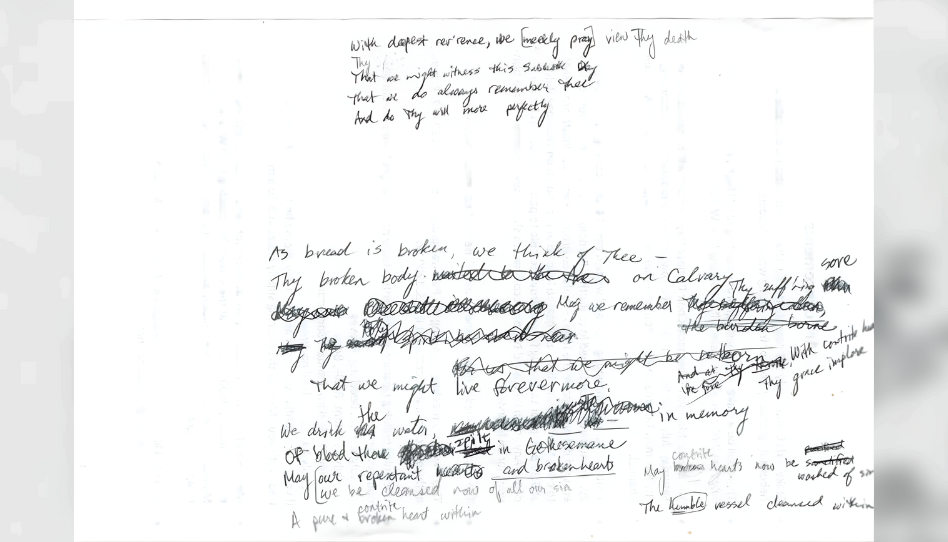“Cuando comenzaron a pasar el pan, estas palabras, junto con una melodía y armonía sencillas, vinieron a mi mente: ‘Al partir el pan, en Ti pensamos’”, dijo Reynolds.