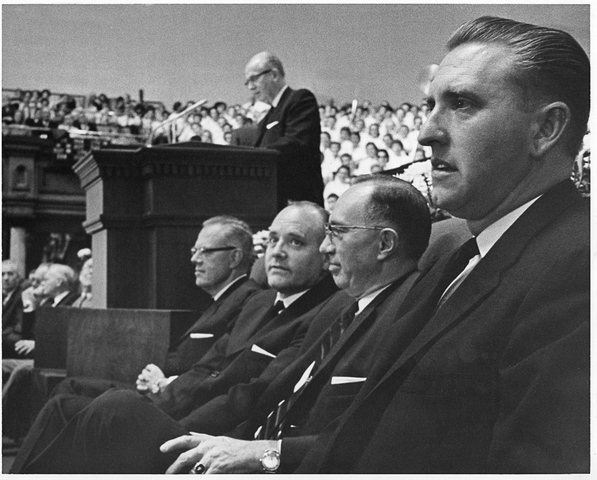En su primera Conferencia General. De derecha a izquierda, los elderes Thomas S. Monson, Gordon B. Hinckley, Howard W. Hunter, Richard L. Evans y Ezra Taft Benson (en el púlpito).