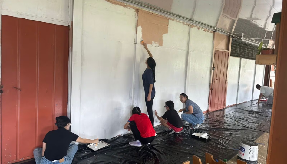 Armados con brochas, pintura y entusiasmo, los participantes —jóvenes y adultos por igual— limpiaron, pintaron y repararon distintas áreas del plantel. Este trabajo se coordinó con la junta de educación local, que proporcionó los materiales necesarios.