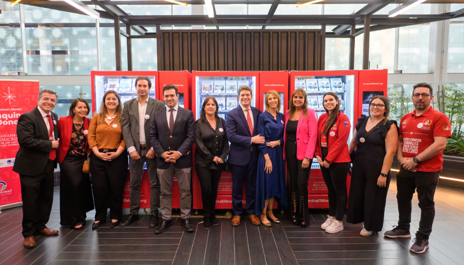 Élder Alan R. Walker posa junto a autoridades de organizaciones benéficas en la inauguración de las máquinas de donaciones en Chile. Imagen: La Iglesia de Jesucristo de los Santos de los Últimos Días