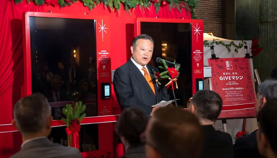 Mitsuya Kodama, secretario general de CARE International, en el evento de lanzamiento de las máquinas de donaciones. Imagen: La Iglesia de Jesucristo de los Santos de los Últimos Días