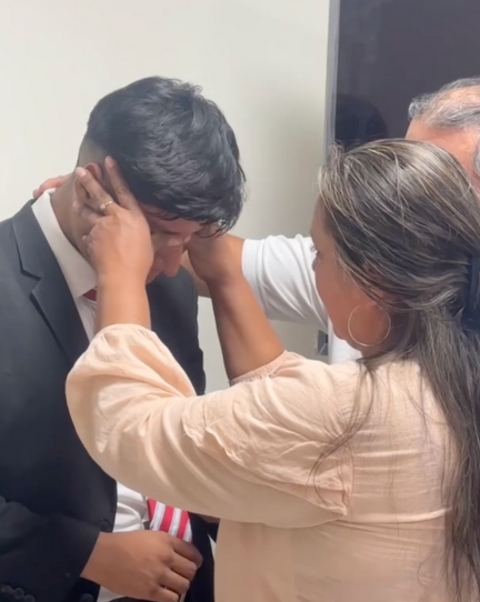 Con lágrimas en los ojos, inclina la cabeza y recibe gestos de consuelo de sus padres.