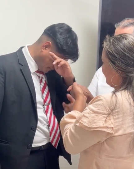 Vestido de traje y corbata, con evidente emoción, permite que su madre retire de su pecho la placa que lo identificó durante dos años como representante de Jesucristo.