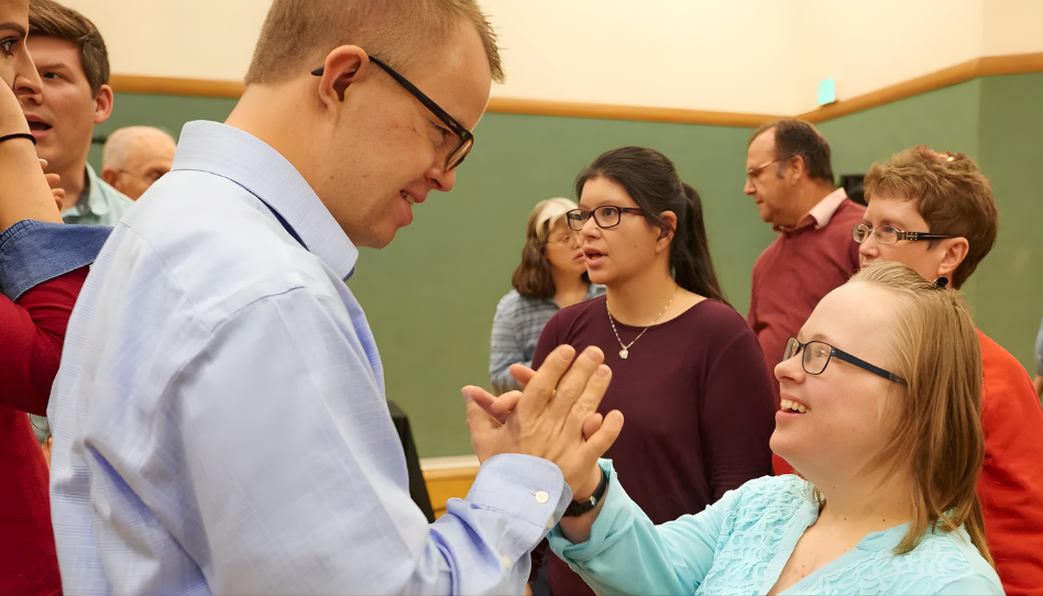 Un especialista en discapacidades ayudando a una mujer joven con síndrome de Down. Imagen: La Iglesia de Jesucristo de los Santos de los Últimos Días