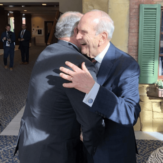 El presidente Russell M. NelsonNelson abrazando al élder Ronald A. Rasband. Imagen: La Iglesia de Jesucristo de los Santos de los Últimos Días
