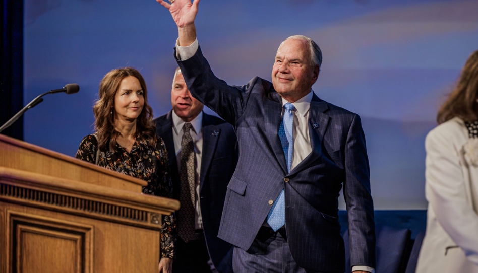 El élder Ronald A. Rasband, del Cuórum de los Doce Apóstoles, saluda a los estudiantes y profesores de BYU en el Centro Marriott en Provo, Utah, el martes 23 de septiembre de 2025. Imagen: La Iglesia de Jesucristo de los Santos de los Últimos Días