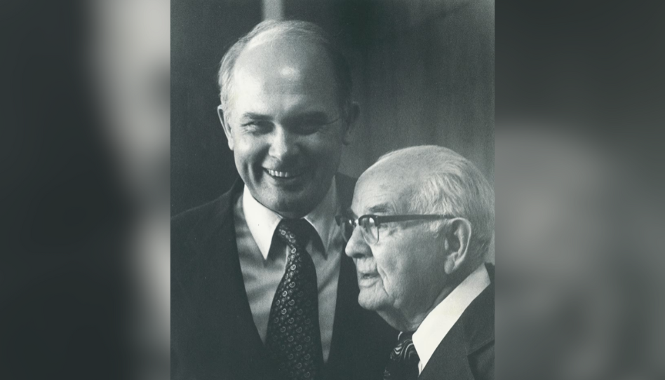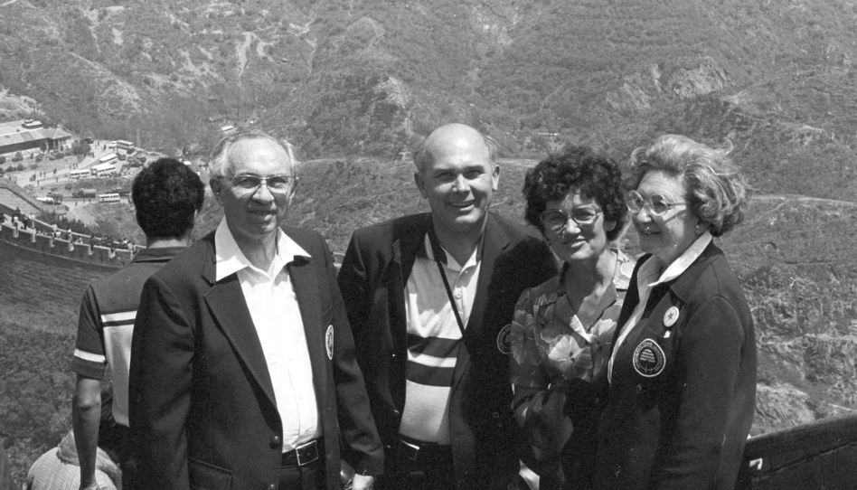 El presidente Hinckley y el presidente Oaks con sus esposas en 1980 durante la gira de los Jóvenes Embajadores de BYU. Imagen: Mark A. Philbrick, BYU