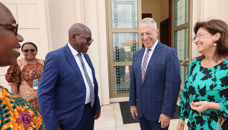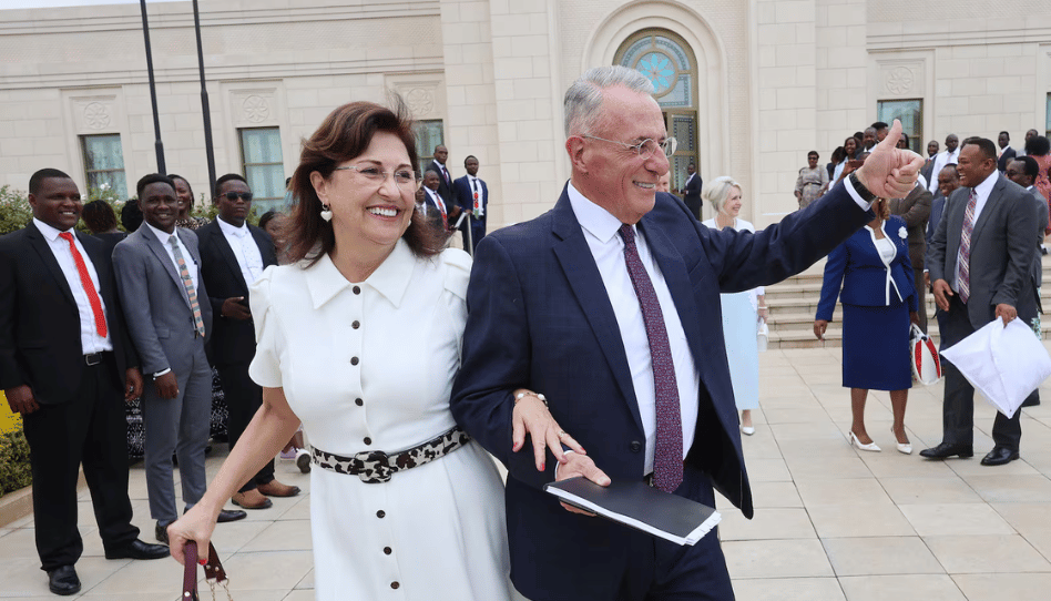 A la derecha, el élder Ulisses Soares, del Cuórum de los Doce Apóstoles de La Iglesia de Jesucristo de los Santos de los Últimos Días, y su esposa, la hermana Rosana Soares, conversan con el presidente del templo, Dominic C. Kogo, y su esposa, la hermana Alice Kogo, en los terrenos del Templo de Nairobi, Kenia, el sábado 17 de mayo de 2025. Créditos: Jeffrey D. Allred. Imagen: Deseret News