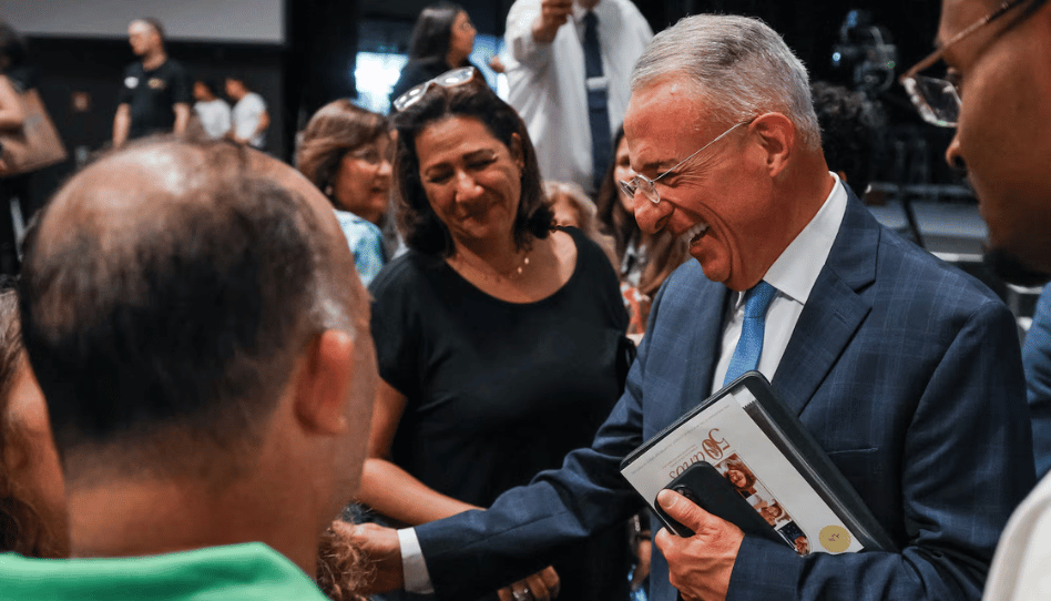 El élder Ulisses Soares, del Cuórum de los Doce Apóstoles, saluda a los visitantes en el Centro de Congresos de Lisboa, Portugal, el 5 de julio de 2025, para celebrar el 50.º aniversario de la Iglesia en ese país. Imagen: La Iglesia de Jesucristo de los Santos de los Últimos Días