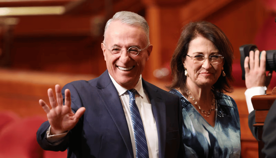 El élder Ulisses Soares, del Cuórum de los Doce Apóstoles de La Iglesia de Jesucristo de los Santos de los Últimos Días, y su esposa, la hermana Rosana Soares, saludan a los asistentes después de la sesión vespertina de la 195.ª Conferencia General Anual de La Iglesia de Jesucristo de los Santos de los Últimos Días en Salt Lake City, el sábado 5 de abril de 2025. Créditos: Jeffrey D. Allred. Imagen: Desere